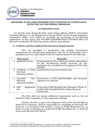 ERC Advisory to DU’s in Compliance to Net-Metering Program