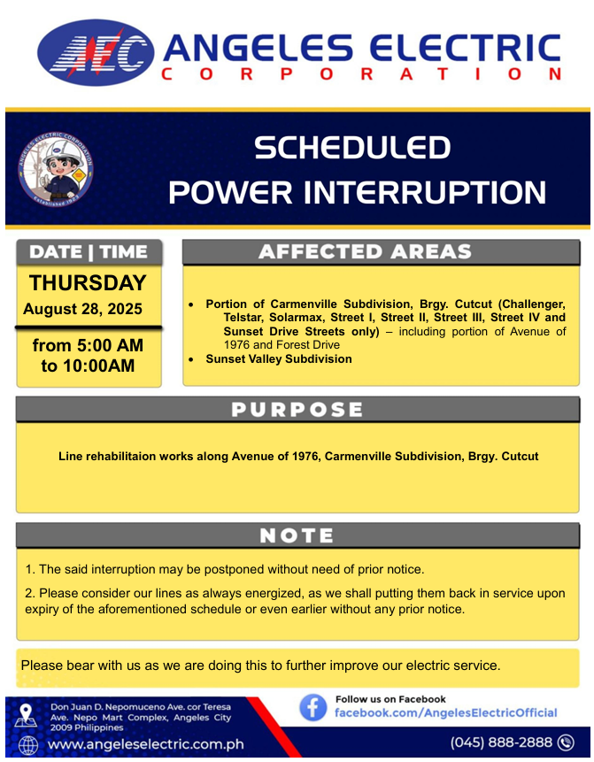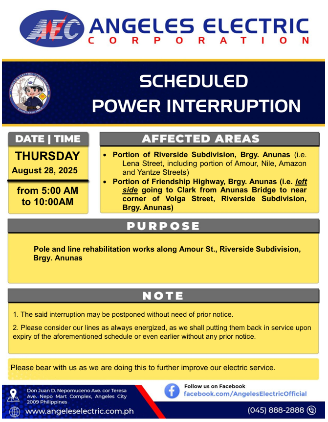 Interruption 8-10-2025 Brgy Amsic, Anunas,Balibago, Malabanas, Dau, Margot, Pulung Maragul, Sapang Bato August 7, 2025 August 7, 2025