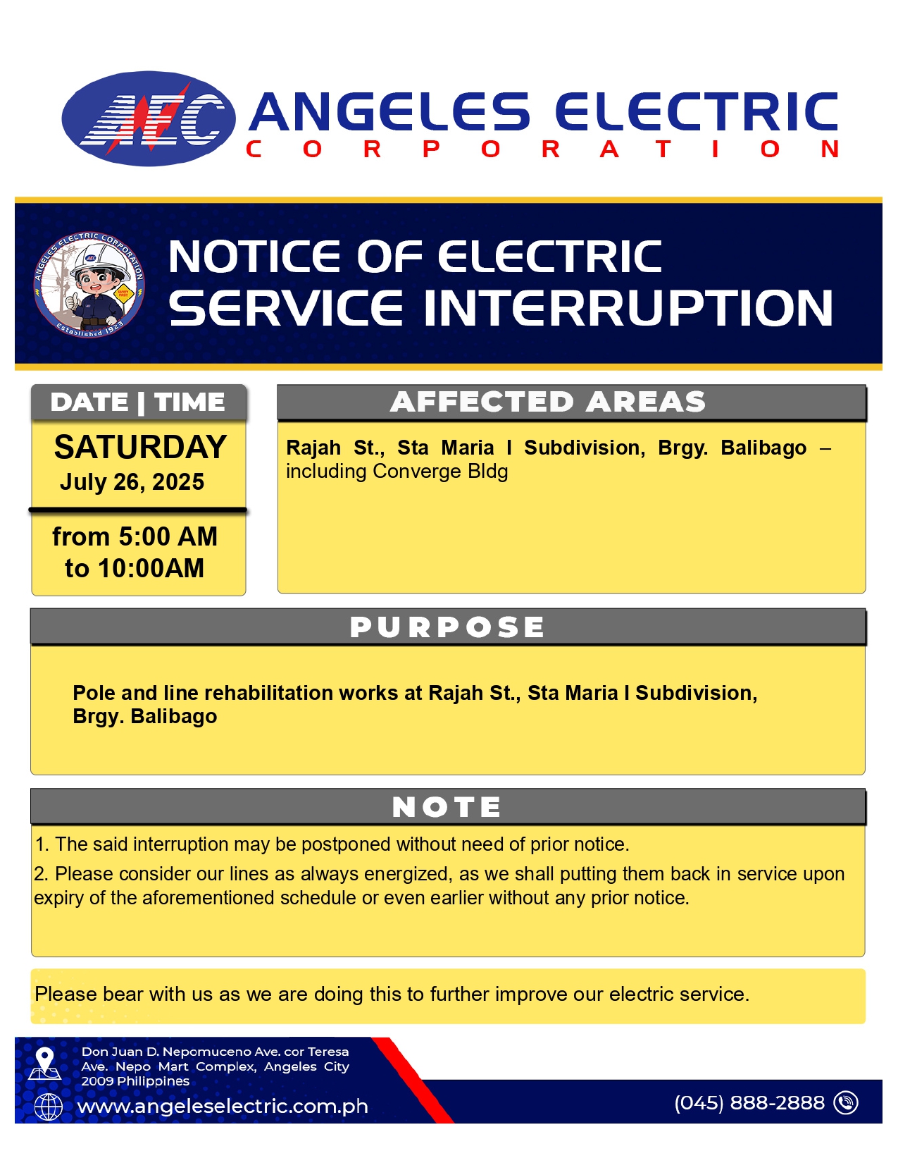 Advisories Interruption 8-7-2025 Zion Villas, Phico Park and portion of Friendship Hiway August 5, 2025 August 5, 2025 Interruption 8-2-2025 Cutud and Duquit, Mabalacat July 31, 2025 July 31, 2025 Interruption 8-2-2025 Zion Villas, Phico Park and portion of Friendship Hiway July 31, 2025 July 31, 2025 Interruption 7-31-2025 Abacan Subd., Abacan Housing Area, and portion of Malabanias July 29, 2025 July 29, 2025 Interruption 7-26-2025 Epza, Pulung Cacutud July 24, 2025 July 24, 2025 Interruption 7-26-2025 Sta.Maria I Balibago July 24, 2025 July 24, 2025 Interruption 7-24-2025 Don Bonifacio Subd. & Mt. View Subd., Balibago July 21, 2025 July 21, 2025 Interruption 7-24-2025 Pampang July 21, 2025 July 21, 2025 Interruption 7-24-2025 Telabastagan, C.S.F.P. July 21, 2025 July 21, 2025 Interruption 7-19-2025 Systems Plus College Foundation & portion of Ninoy Aquino July 17, 2025 July 17, 2025 Pagination ← 1 … 6 7 8 9 10 … 14 →